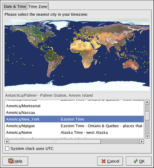 To configure the system time zone, click the Time Zone tab. The time zone can be changed by either using the interactive map or by choosing the desired time zone from the list below the map. To use the map, click on the city that represents the desired time zone. A red X appears and the time zone selection changes in the list below the map. Click OK to apply the changes and exit the program.