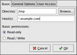 Host(s) — Specify the host(s) to which to share the directory. Refer to Section 23.3.2 Hostname Formats for an explanation of possible formats.