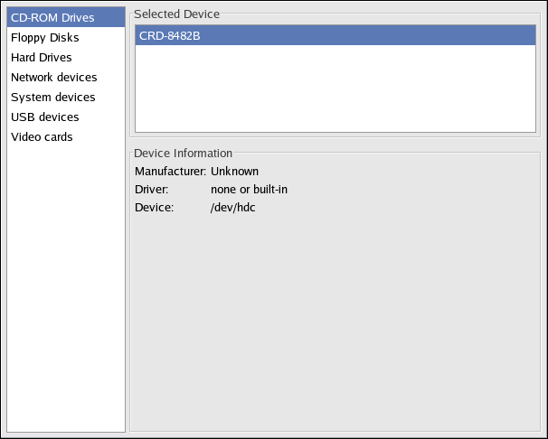 If you are having trouble configuring your hardware or just want to know what hardware is in your system, you can use the Hardware Browser application to display the hardware that can be probed. To start the program from the desktop, select Main Menu Button => System Tools => Hardware Browser or type hwbrowser at a shell prompt. As shown in Figure 42-3, it displays your CD-ROM devices, floppy disks, hard drives and their partitions, network devices, pointing devices, system devices, and video cards. Click on the category name in the left menu, and the information will be displayed.